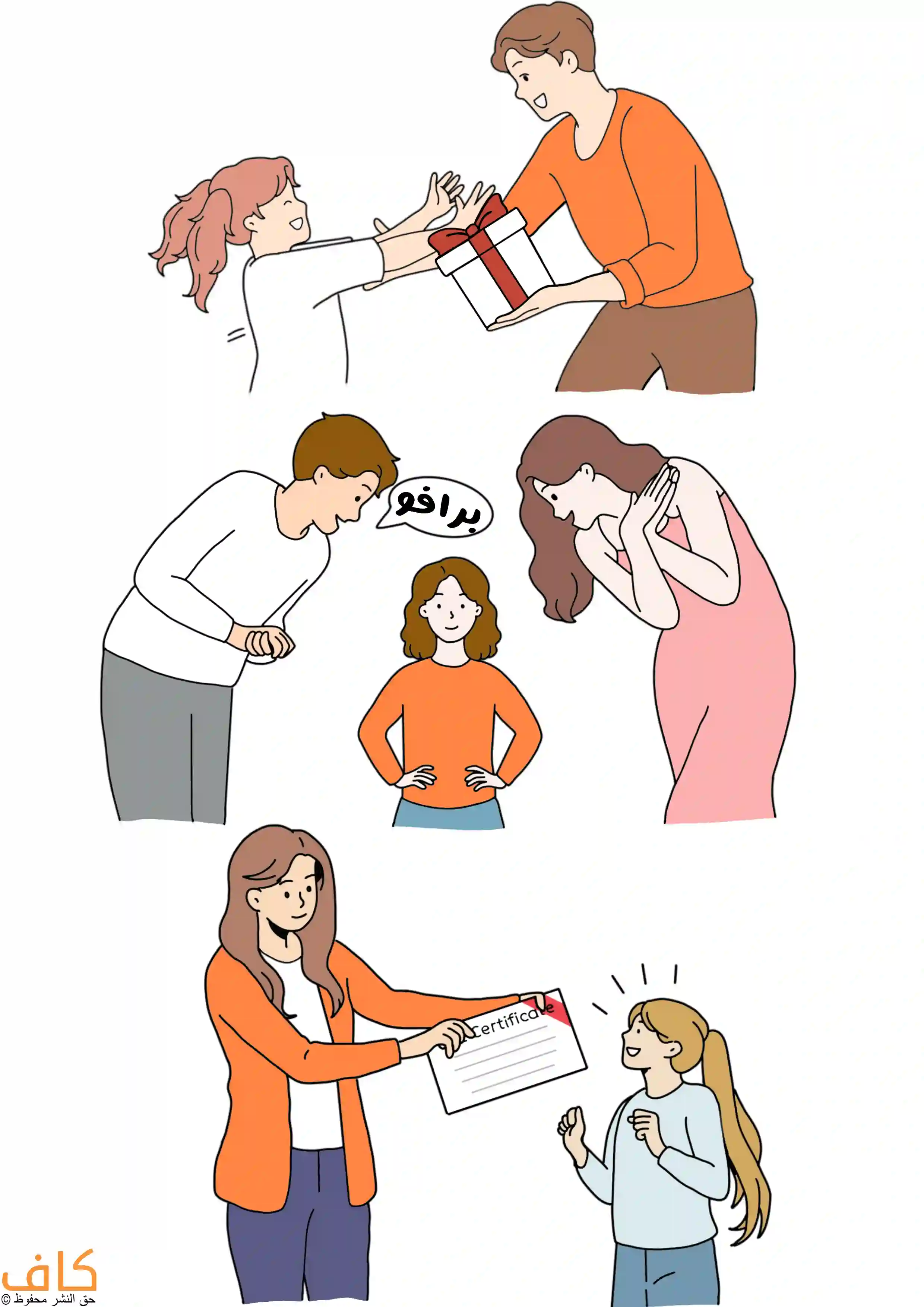 رسمة توضيحية تُظهر مواقف مختلفة لتطبيق العقاب الإيجابي مع الأطفال مثل أب يمنح طفلته هدية كتعبير عن التعزيز، ووالدان يمدحان طفلتهما بابتسامة وتشجيع وكلمة برافو، ومعلمة تُسلم طالبة شهادة تقدير بينما تبدو الطفلة سعيدة وفخورة بنفسها.